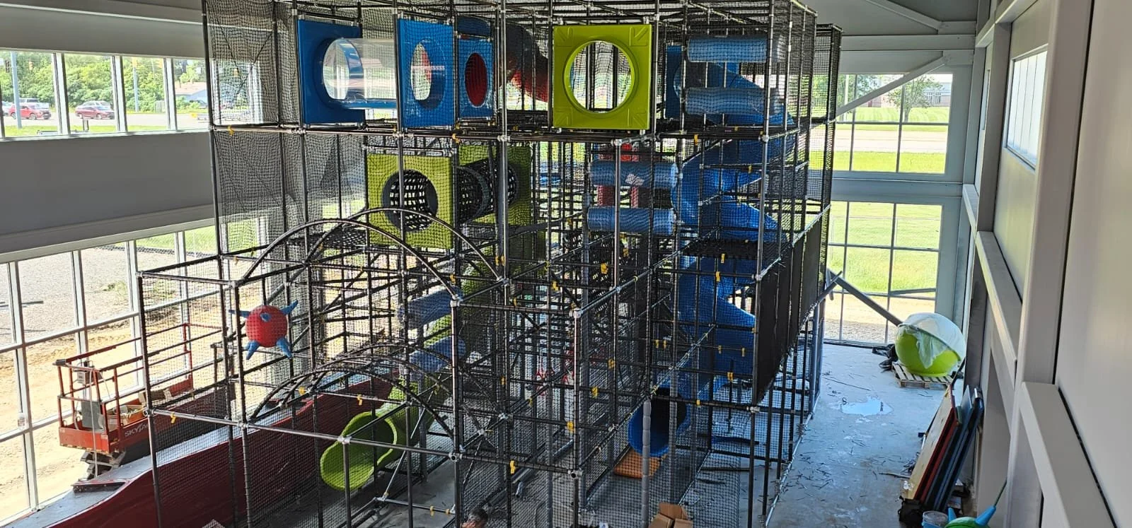 The play structure is 48’x30’x22’ and features a vast array of fun and challenging play events: 4-level spiral slide, a 3-level, two land open wave slide, multiple crawl tubes, clear climbing walls, ninja play obstacles, sea of rings, arch bridge, clear dome lookout, and much more. The playground also includes a dedicated toddler zone with multiple elements appropriate for crawlers up to 3+ years old. The maximum recommended capacity is roughly 200 children playing at the same time.